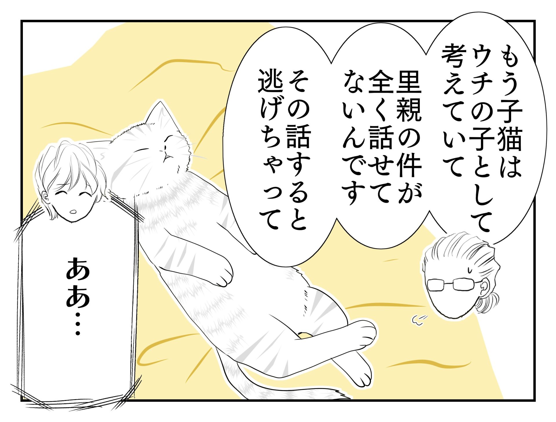 スポンサーリンク おすすめ記事思い出の老猫日誌〜桃姐と小論〜第1章 桃姐のこと1...思い出の老猫日誌〜桃姐と小論〜第1章 桃姐のこと1...思い出の老猫日誌〜桃姐と小論〜第1章 桃姐のこと1...思い出の老猫日誌〜桃姐と小論〜第1章 桃姐のこと1...思い出の老猫日誌〜桃姐と小論〜第1章 桃姐のこと1... 茶トラの小さな女の子35 猫漫画2023.09.03スポンサーリンク 前回↑画像クリックで前話へ茶トラの小さな女の子35広告 広告 あとがき猫を迎え入れるときも家族皆んなの賛同は必要不可欠ですが、送り出すときもそれは必要なのではないかと思っています。 そしてメロの出来事で結婚してから今までずっと避けてきた夫婦問題にも向き合うことになりました。 茶トラの小さな女の子36へ続きます 毎日 昼頃 更新中です 3