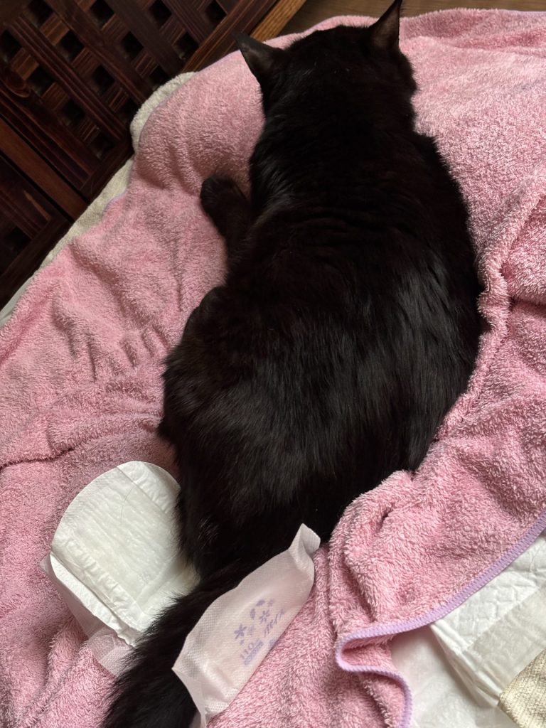 ペットシーツ敷いてるけど、ビショビショになってしまうので尿パットを尻のあたりに敷いてる。