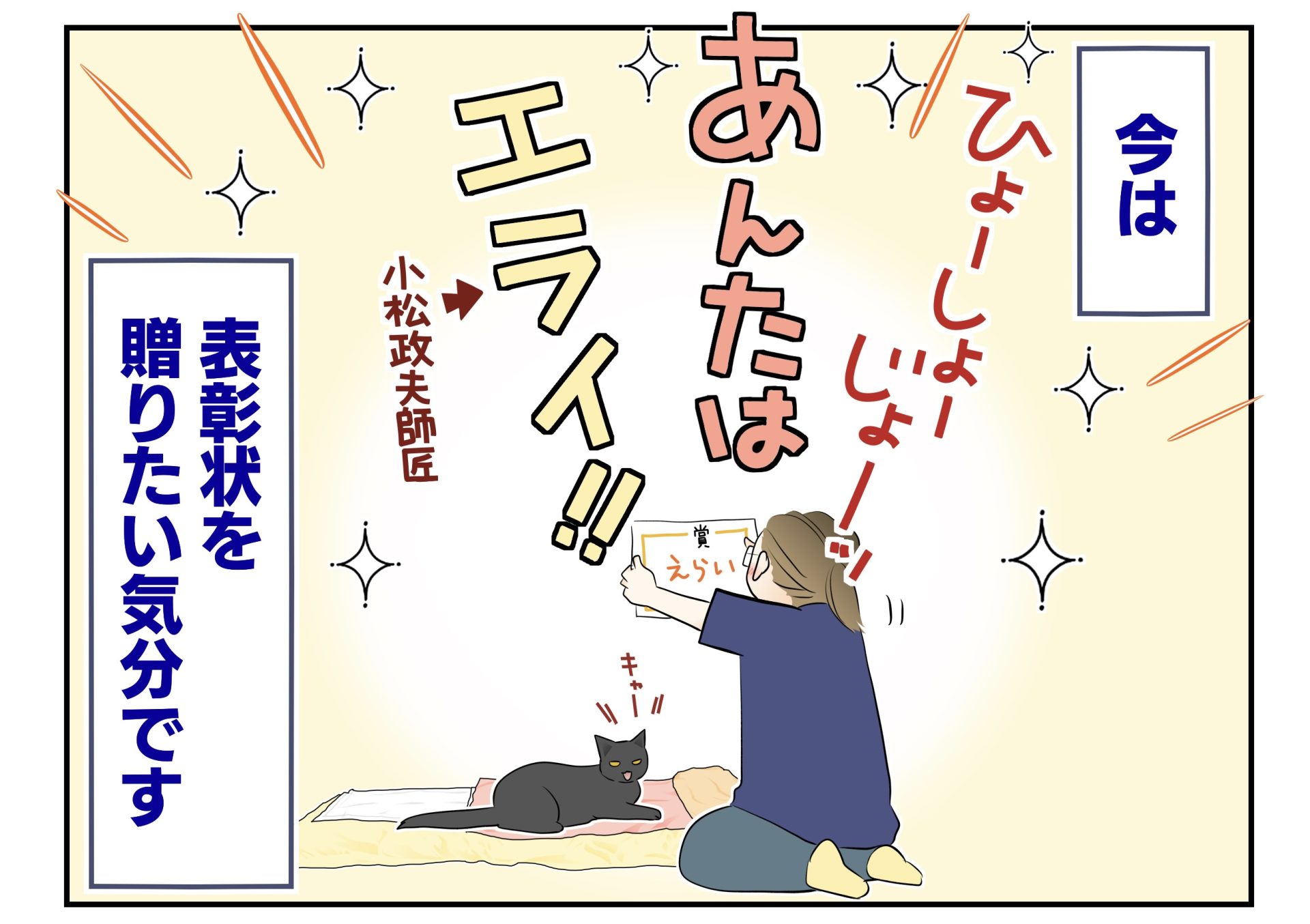 「表彰状〜!あんたはエライ!」は小松政夫さんのギャグです。わからない方はググってみてね!そして伝わった方は同年代ですね♡