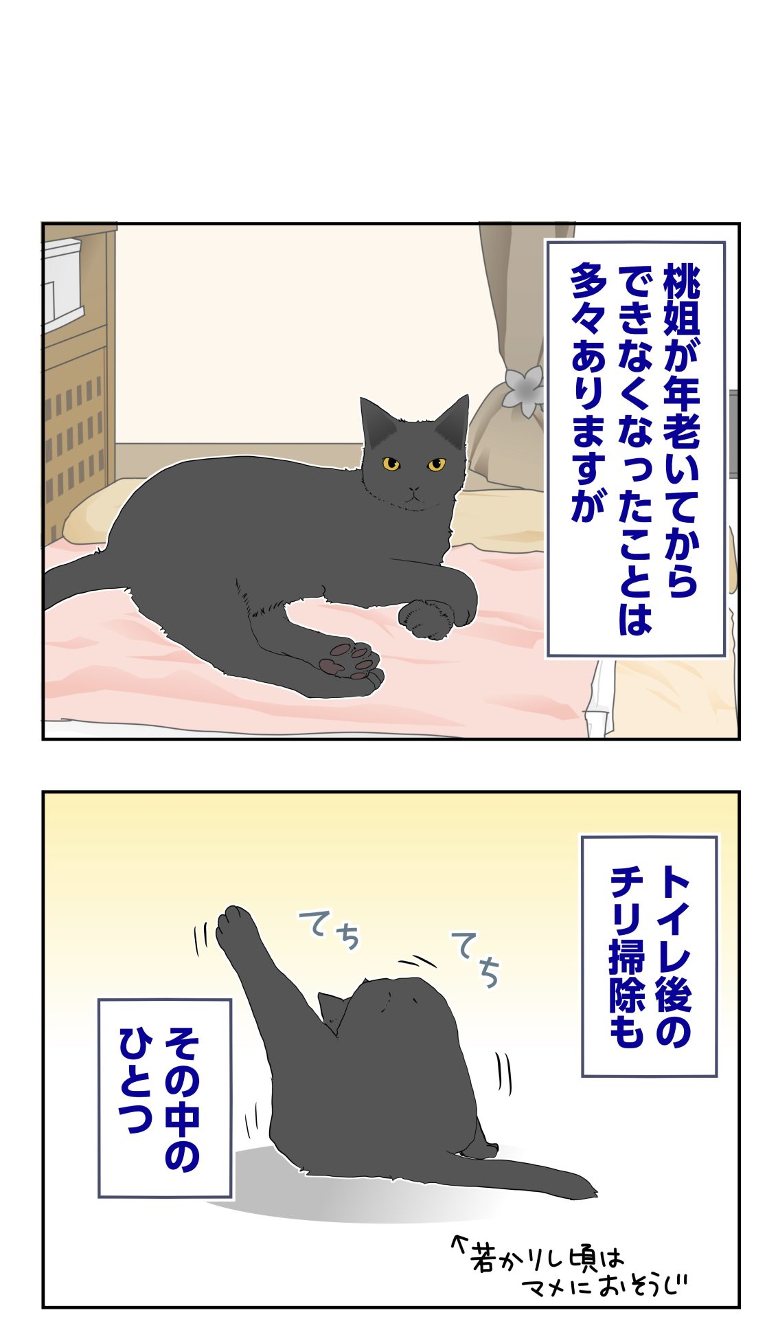 桃ちゃん、お尻キレイがすきなのですか? 我が家の黒猫まっくも、年齢とスコ特有の関節炎で