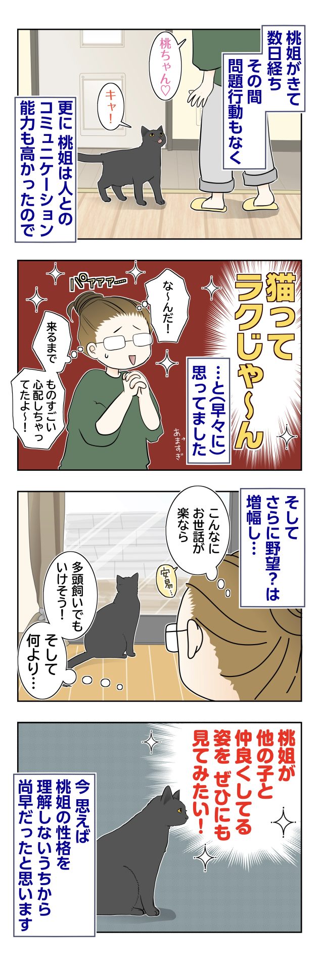 そして、あまりにも桃姐との生活が落ち着いた毎日だったので「猫のお世話って楽ちん〜」なんて安易に思ってしまったのでした…。