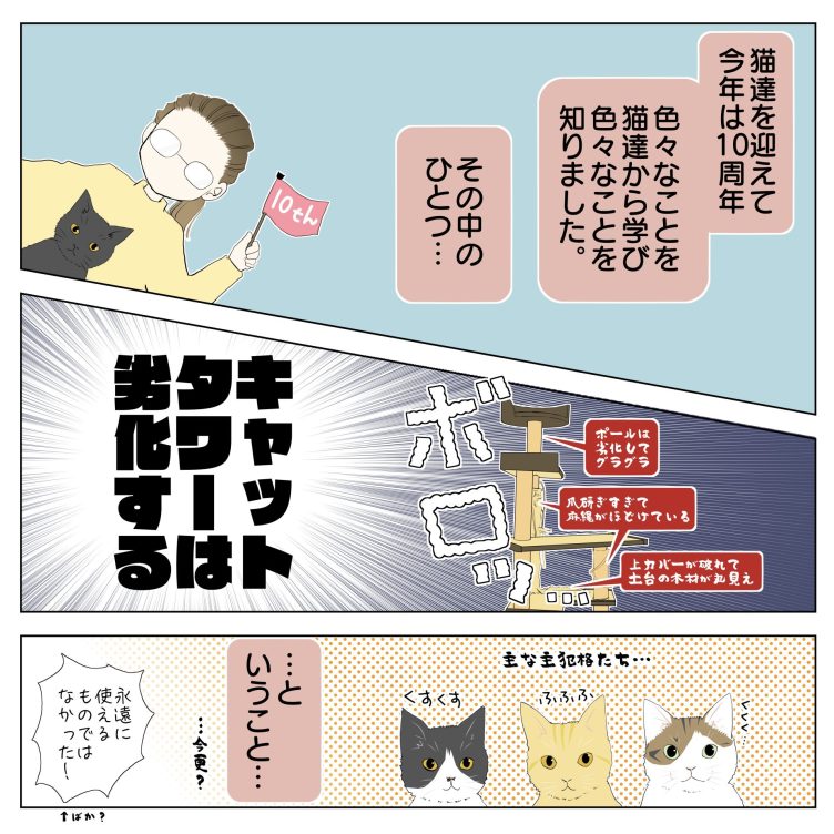PR漫画です。キャットタワーが壊れる寸前の我が家に救いの手が…!